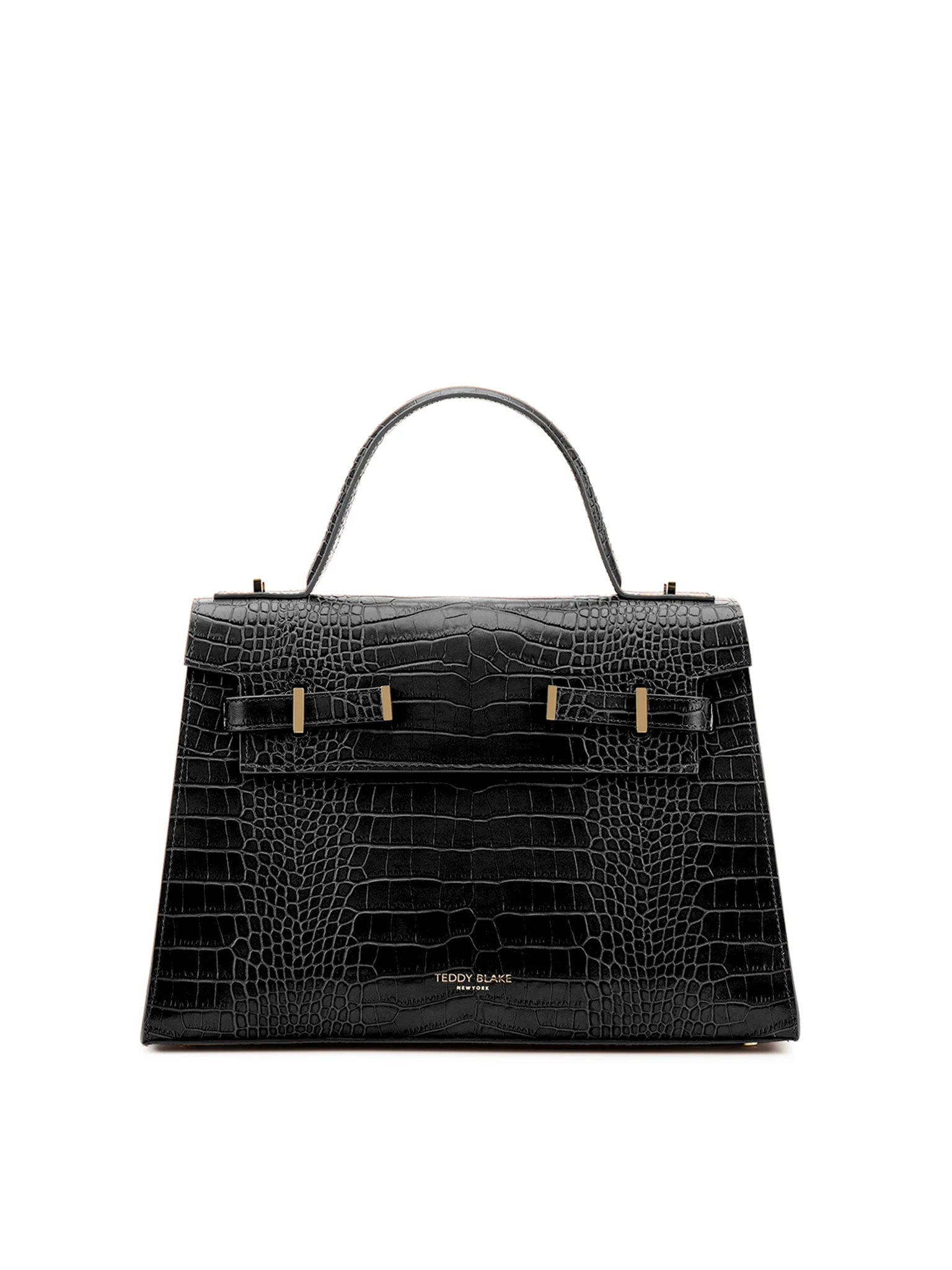The New Ava by Teddy Blake signs a modern twist to an iconic chic design. Crafted by expert artisans in Italy with croco embossed calf skin. The style features a single round handle with a flap closure that opens to reveal a soft suede interior and well though compartmentalization with side pockets included. The Ava bag can take you from a ladies luncheon to an evening out without missing a beat when it comes to style and elegance.