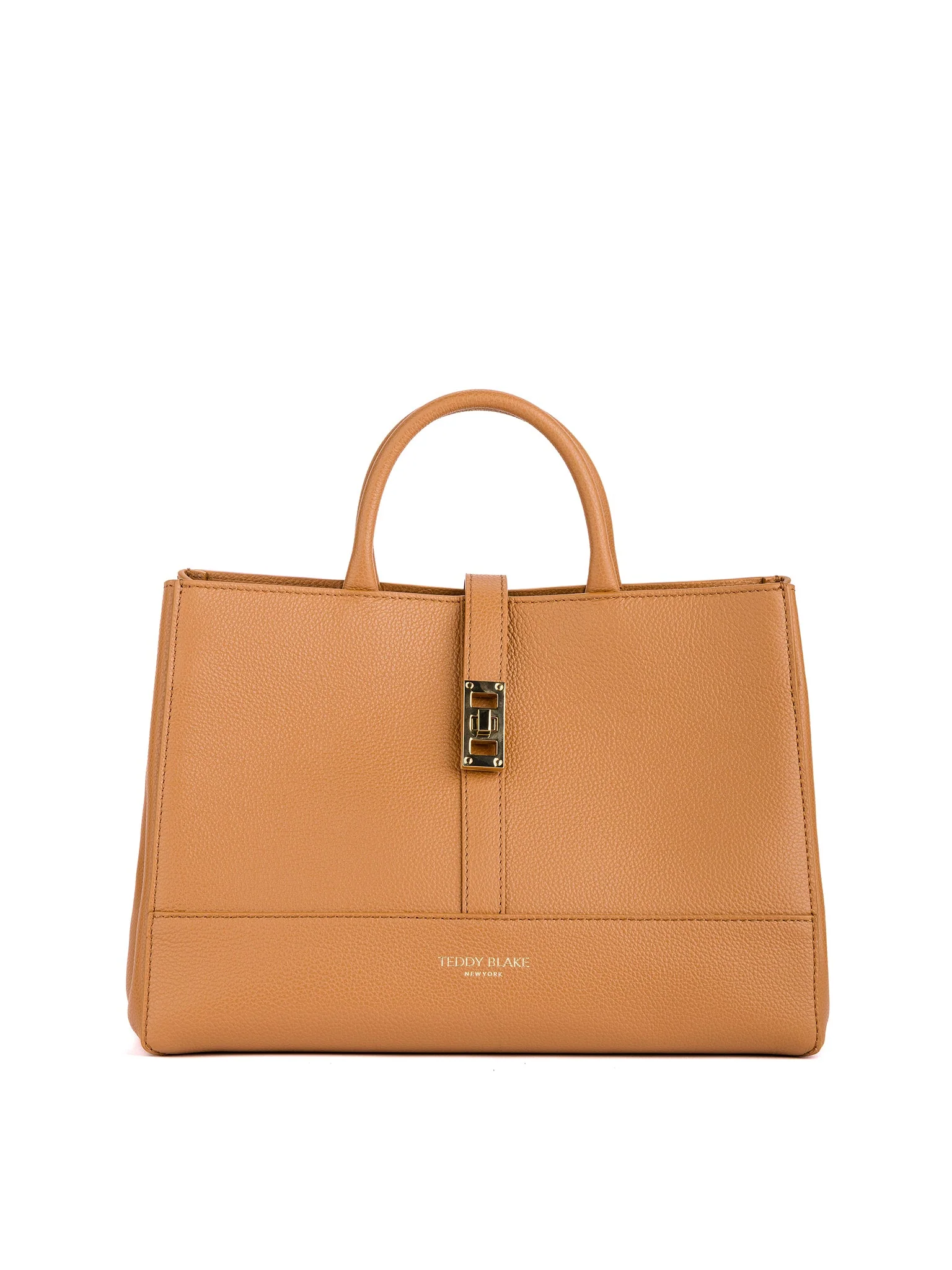 Fashion & function describes the Lola bag, the latest addition to Teddy Blake's line. Crafted in Italy from soft pebbled leather, the boxy silhouette offers versatility with double top handle, shoulder strap, and a spacious, suede-lined interior. Adorned with gold detailing the center strap closure ads a dash or retro chic to its modern appeal. Style the Lola your way, every day from the office into the city.