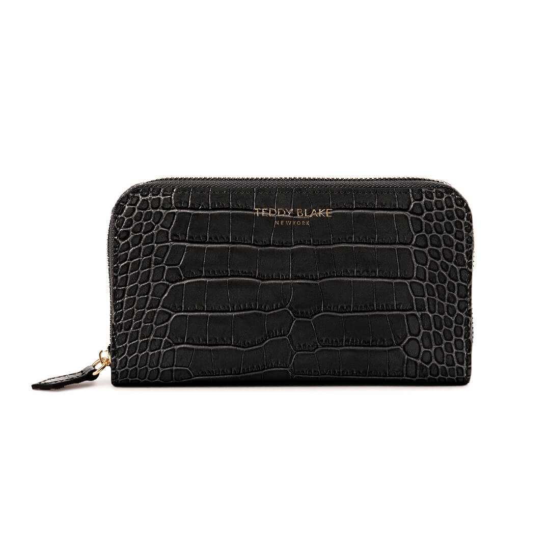 Teddy Blake's new wallet line makes an elevated addition to your accessories edit. Crafted in Italy from croco embossed calf skin, the classic style opens to reveal a red interior with a central zip compartment and multiple organizational features.